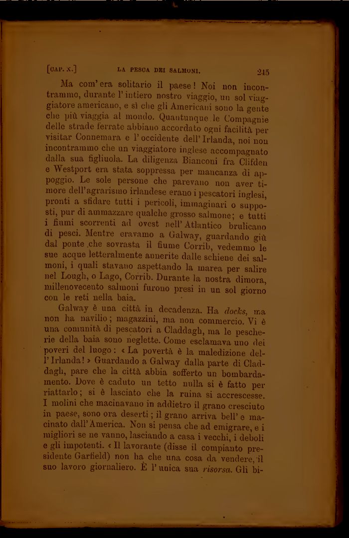 Ma com' era solitario il paese ! Noi non incontrammo, durante l'intiero nostro viaggio, un sol viaggiatore americano, e sì che gli Americani sono la gente che più viaggia al mondo. Quantunque le Compagnie delle strade ferrate abbiano accordato ogni facilità per visitar Connemara e l'occidente dell' Irlanda, noi non incontrammo che un viaggiatore inglese accompaguato dalla sua figliuola. La diligenza Bianconi fra Clifden e Westport era stata soppressa per mancanza di appoggio. Le sole persone che parevano non aver timore dell'agrarismo irlandese erauo i pescatori inglesi, pronti a sfidare tutti i pericoli, immaginari o supposti, pur di ammazzare qualche grosso salmone; e tutti i fiumi scorrenti ad ovest nell' Atlantico brulicano di pesci. Mentre eravamo a Galway, guardando giù dal ponte .che sovrasta il fiume Corrib, vedemmo le sue acque letteralmente annerite dalle schiene dei salmoni, i quali stavano aspettando la marea per salire nel Lough, o Lago, Corrib. Durante la nostra dimora, millenovecento salmoni furono presi in un sol giorno con le reti nella baia.