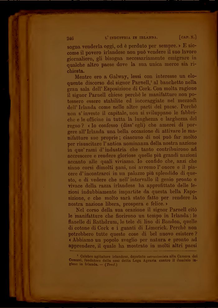 Mentre ero a Gahvay, lessi con interesse un eloquente discorso del signor Parnell,1 al banchetto nella gran sala dell' Esposizione di Cork. Con molta ragione il signor Parnell chiese perchè le manifatture non potessero essere stabilite ed incoraggiate nel mezzodì dell' Irlanda come nelle altre parti del paese. Perchè non s'investe il capitale, non si sviluppano le labbri-che e le officine in tutta la lunghezza e larghezza del regno ? < lo confesso (diss' egli) che amerei di porgere all'Irlanda una bella occasione di attivare le manifatture sue proprie ; ciascuno di noi può far molto per risuscitare l'antica nominanza della nostra nazione in que' rami d'industria che tanto contribuirono ad accrescere e rendere gloriose quelle più grandi nazioni accanto alle quali viviamo. Io confido che, anzi che siano corsi dimolti anni, noi avremo l'onore e il piacere d'incontrarci in un palazzo più splendido di questo, e di vedere che nell' intervallo il genio pronto e vivace della razza irlandese ha approfittato delle lezioni indubbiamente impartite da questa bella Esposizione, e che molto sarà stato fatto per rendere la nostra nazione libera, prospera e felice. >