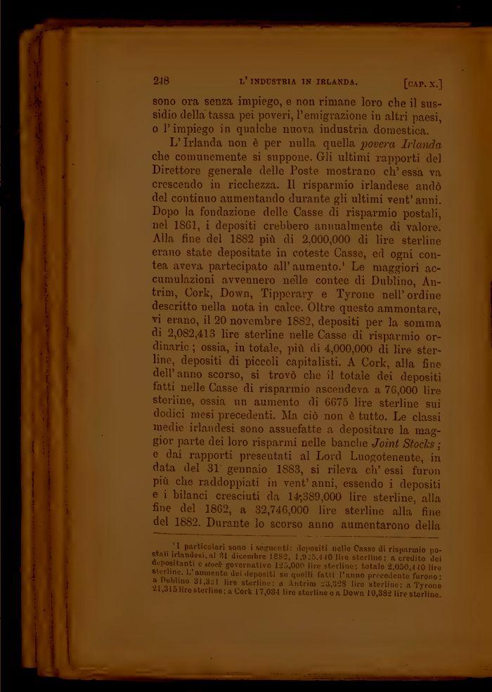 L'Irlanda non è per nulla quella povera Irlanda che comunemente si suppone. Gli ultimi rapporti del Direttore generale delle Poste mostrano eh' essa va crescendo in ricchezza. Il risparmio irlandese andò del continuo aumentando durante gli ultimi vent'anni. Dopo la fondazione delle Casse di risparmio postali, nel 1861, i depositi crebbero annualmente di valore. Alla fine del 1S82 più di 2,000,000 di lire sterline erano state depositate in coteste Casse, ed ogni contea aveva partecipato all'aumento.1 Le maggiori accumulazioni avvennero nelle contee di Dublino, An-trim, Cork, Down, Tipperary e Tyrono nell'ordine descritto nella nota in calce. Oltre questo ammontare, vi erano, il 20 novembre 18S2, depositi per la somma di 2,082,413 lire sterline nelle Casse di risparmio ordinario ; ossia, in totale, più di 4,000,000 di lire sterline, depositi di piccoli capitalisti. A Cork, alla fine dell'anno scorso, si trovò che il totale dei depositi fatti nelle Casse di risparmio ascendeva a 76,000 lire sterline, ossia un aumento di 6675 lire sterline sui dodici mesi precedenti. Ma ciò non è tutto. Le classi medie irlandesi sono assuefatte a depositare la maggior parte dei loro risparmi nelle banche Joint Stoclcs ; e dai rapporti presentati al Lord Luogoteneute, in data del 31 gennaio 1883, si rileva eh' essi furon più che raddoppiati in vent' anni, essendo i depositi e i bilanci cresciuti da 14-,389,000 lire sterline, alla fine del 1862, a 32,746,000 lire sterline alla fine del 1882. Durante lo scorso anno aumentarono della