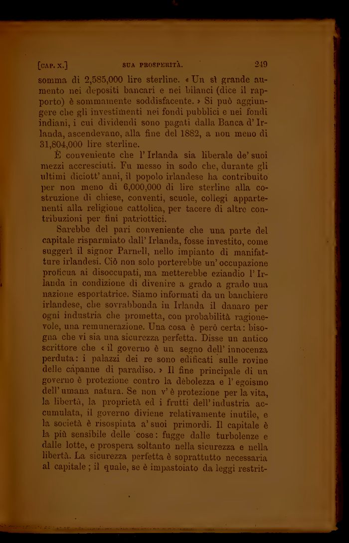 Sarebbe del pari conveniente che una parte del capitale risparmiato dall' Irlanda, fosse investito, come suggerì il signor Parnell, nello impianto di manifatture irlandesi. Ciò non solo porterebbe un'occupazione proficua ai disoccupati, ma metterebbe eziandio l'Irlanda in condizione di divenire a grado a grado una nazione esportatrice. Siamo informati da un banchiere irlandese, che sovrabbonda in Irlanda il danaro per ogni industria che prometta, con probabilità ragionevole, una remunerazione. Una cosa è però certa : bisogna che vi sia una sicurezza perfetta. Disse un antico scrittore che < il governo è un segno dell' innocenza perduta: i palazzi dei re sono edificati sulle rovine delle cjipanne di paradiso. > Il fine principale di un governo è protezione contro la debolezza e 1' egoismo dell'umana natura. Se non v'è protezione per la vita, la libertà, la proprietà ed i frutti dell' industria accumulata, il governo diviene relativamente inutile, e la società è risospinta a' suoi primordi. Il capitale è la più sensibile delle cose: fugge dalle turbolenze e dalle lotte, e prospera soltanto nella sicurezza e nella libertà. La sicurezza perfetta è soprattutto necessaria al capitale ; il quale, se è impastoiato da leggi restrit-
