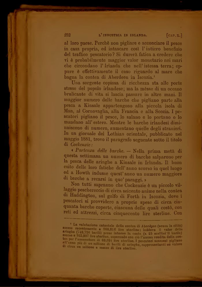 1 La valutazione catastalo della contea di Aberdpen (seuza la città) ascese recentemente i S66.S16 lire sterline; laddove il valor dello aringhe (745,72(5 barili) prese intorno la costa (a '25 scellini'il barile) ascese e 935,907 lire sterline, superando con ciò l'annua reudita della contea per l'ammontare di 69,091 lire sterline. I pescatori scozzesi pigliano ali anno più di un milione di binili di aringhe, rappresentanti un valore di circa un milione e mezzo di lire sterline.