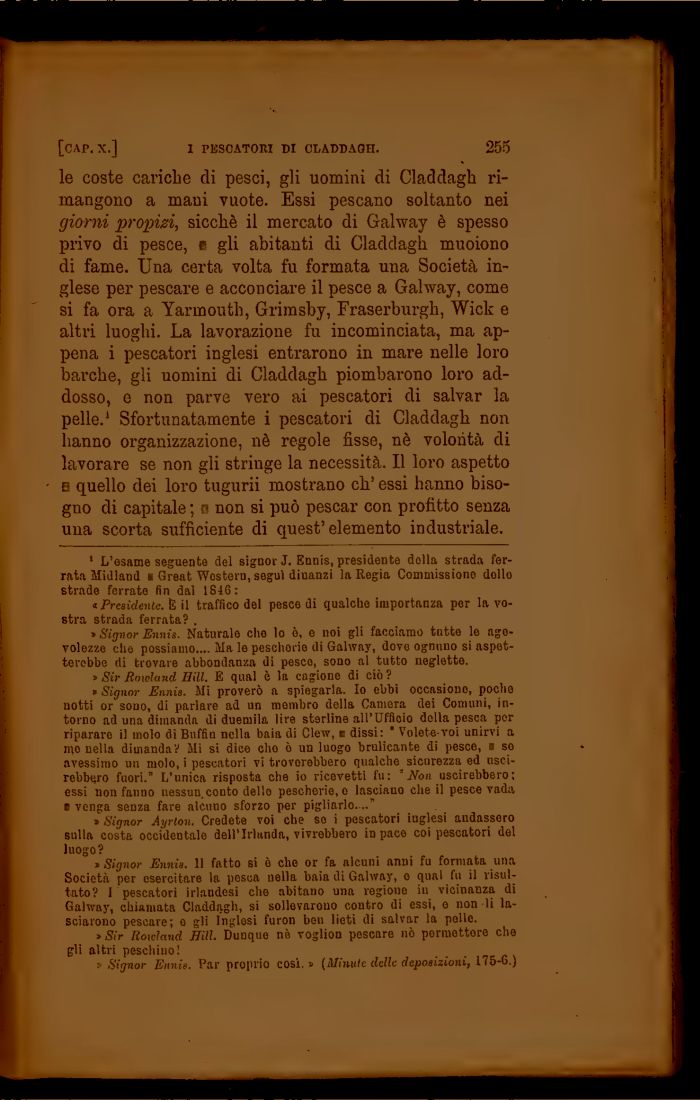 • Signor Ennis. 11 fatto si è che or fa alcuni anni fu formata una Società per esercitare la pesca nella baia di Galway, e qual fu il risultato? I pescatori irlandesi che abitano una regione in vicinanza di Galway, chiamata Claddagh, si sollevarono contro di essi, e non li lasciarono pescare; o gli Inglesi furon boa lieti di salvar la pelle.
