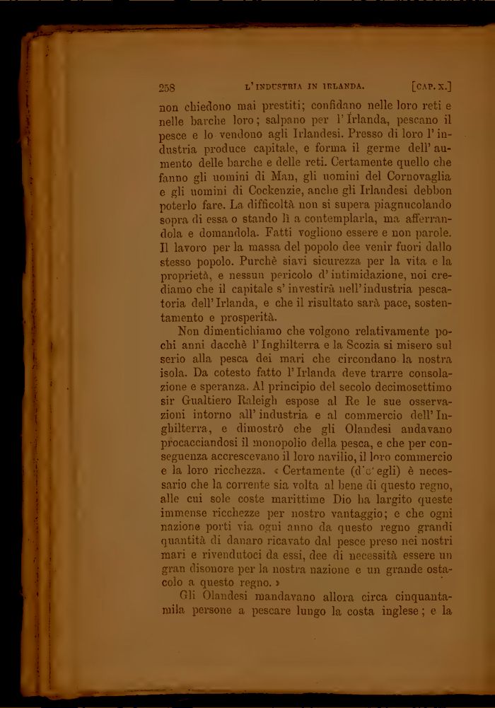 Non dimentichiamo che volgono relativamente pochi anni dacché l'Inghilterra e la Scozia si misero sul serio alla pesca dei mari che circondano la nostra isola. Da cotesto fatto l'Irlanda deve trarre consolazione e speranza. Al principio del secolo decimosettimo sir Gualtiero Raleigh espose al Ee le sue osservazioni intorno all' industria e al commercio dell' Inghilterra, e dimostrò che gli Olandesi andavano procacciandosi il monopolio della pesca, e che per conseguenza accrescevano il loro navilio, il loro commercio e la loro ricchezza. «Certamente (d'c'egli) è necessario che la corrente sia volta al bene di questo regno, alle cui sole coste marittime Dio ha largito queste immense ricchezze per nostro vantaggio; e che ogni nazione porti via ogni anno da questo regno grandi quantità di danaro ricavato dal pesce preso nei nostri mari e rivendutoci da essi, dee di necessità essere un gran disonore per la nostra nazione e un grande ostacolo a questo regno. »