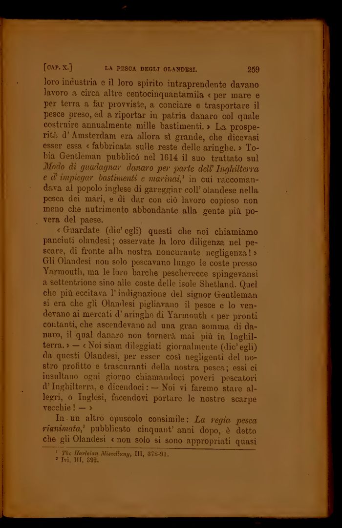 « Guardate (die' egli) questi che noi chiamiamo panciuti olandesi ; osservate la loro diligenza nel pescare, di fronte alla nostra noncurante negligenza ! » Gli Olandesi non solo pescavano lungo le coste presso Yarmouth, ma le loro barche pescherecce spingevansi a settentrione sino alle coste delle isole Shetland. Quel che più eccitava l'indignazione del signor Gentleman si era che gli Olandesi pigliavano il pesce e lo vendevano ai mercati d'aringhe di Yarmouth « per pronti contanti, che ascendevano ad una gran somma di da-nai'o, il qual danaro non tornerà mai più in Inghilterra. » — « Noi siam dileggiati giornalmente (die'egli) da questi Olandesi, per esser così negligenti del nostro profitto e trascuranti della nostra pesca; essi ci insultano ogni giorno chiamandoci poveri pescatori d'Inghilterra, e dicendoci : —Noi vi faremo stare allegri, o Inglesi, facendovi portare le nostre scarpe vecchie ! — >