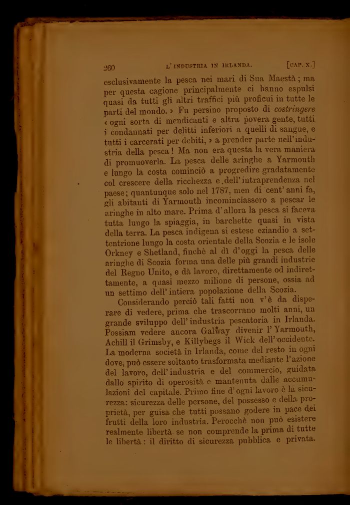 Considerando perciò tali fatti non v'è da disperare di vedere, prima che trascorrano molti anni, un grande sviluppo dell' industria pescatoria in Irlanda. Possiam vedere ancora Galway divenir l'Yarmouth, Achill il Grimsby, e Killybegs il Wiclc dell' occidente. La moderna società in Irlanda, come del resto in ogni dove, può essere soltanto trasformata mediante l'azione del lavoro, dell' industria e del commercio, guidata dallo spirito di operosità e mantenuta dalle accumulazioni del capitale. Primo fine d'ogni lavoro è la sicurezza: sicurezza delle persone, del possesso e della proprietà, per guisa che tutti possano godere in pace dei frutti della loro industria. Perocché non può esistere realmente libertà se non comprende la prima di tutte le libertà : il diritto di sicurezza pubblica e privata.