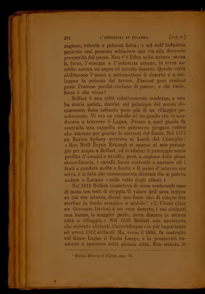 Nel 1612 Belfast consisteva di circa centoventi case di mota con tetti di stoppia.'Il valore dell'area intiera su cui era situata, dicesi non fosse che di cinque lire sterline in feudo semplice o mobile.1 * L'Ulster (dice sir Giovanni Davies) è un vero deserto, i cui abitanti non hanno, la maggior parte, certa dimora in alcuna città o villaggio. > Nel 1659 Belfast non conteneva che seicento abitanti. Carrickfergus era più importante ed aveva 1312 abitanti. Ma, verso il 1660, fu costruito sul fiume Lagan il Ponte Lungo, e la prosperità cominciò a spuntare nella piccola città. Era situata in