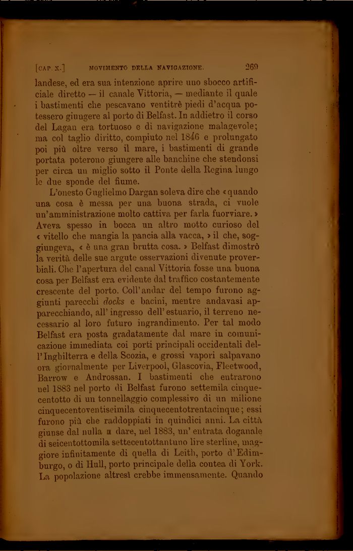 L'onesto Guglielmo Dargan soleva dire che Aveva spesso in bocca un altro motto curioso del « vitello che mangia la pancia alla vacca, > il che, soggiungeva, * è una gran brutta cosa. » Belfast dimostrò la verità delle sue argute osservazioni divenute proverbiali. Che l'apertura del canal Vittoria fosse una buona cosa per Belfast era evidente dal traffico costantemente crescente del porto. Coli'andar del tempo furono aggiunti parecchi doclcs e bacini, mentre andavasi apparecchiando, all' ingresso dell' estuario, il terreno necessario al loro futuro ingrandimento. Per tal modo Belfast era posta gradatamente dal mare in comunicazione immediata coi porti principali occidentali dell'Inghilterra e della Scozia, e grossi vapori salpavano ora giornalmente per Liverpool, Glascovia, Fleetwood, Barrow e Androssan. I bastimenti che entrarono nel 1883 nel porto di Belfast furono settemila cinque-centotto di un tonnellaggio complessivo di un milione cinquecentoventiseimila cinquecentotrentacinque ; essi furono più che raddoppiati in quindici anni. La città giunse dal nulla a dare, nel 1883, un' entrata doganale di seicentottomila setteceutottantuno lire sterline, maggiore infinitamente di quella di Leith, porto d'Edimburgo, o di Iiull, porto principale della contea di York. La popolazione altresì crebbe immensamente. Quando