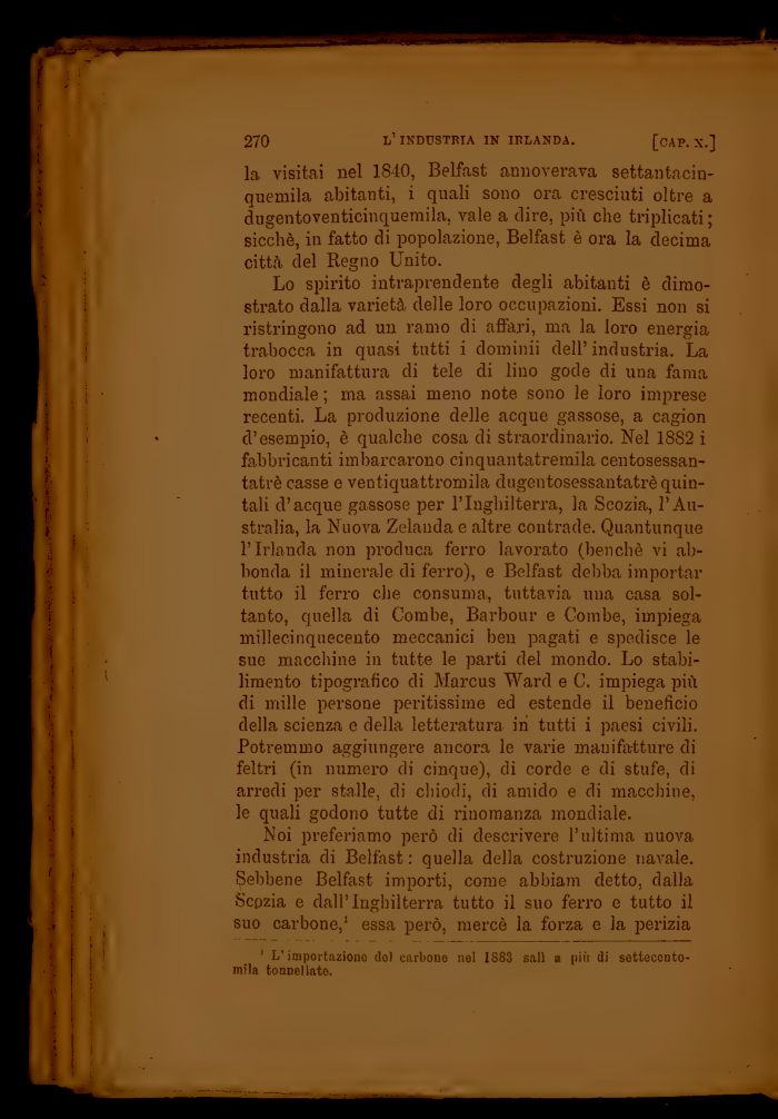Noi preferiamo però di descrivere l'ultima nuova industria di Belfast : quella della costruzione navale. Sebbene Belfast importi, come abbiam detto, dalla Scozia e dall'Inghilterra tutto il suo ferro e tutto il suo carbone,1 essa però, mercè la forza e la perizia