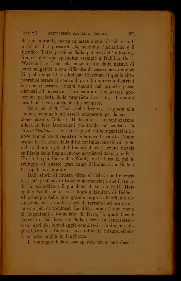 de'suoi abitanti, mette in mare alcuni de'più grandi e de' più bei piroscafi cbe solchino 1' Atlantico e il Pacifico. Tutto proviene dalla potenza dell'individualità, ed offre uno splendido esempio a Dublino, Cork, Waterford e Limerick, città fornite dalla natura di porti magnifici e con difficoltà d'accesso assai minori di quelle superate da Belfast. Ciascuna di quelle città potrebbe essere il centro di grandi imprese industriali sol che vi fossero uomini amanti del proprio paese disposti ad investire i loro capitali, e si avesse protezione perfetta della proprietà investita, ed uomini pronti al lavoro anziché allo sciopero.