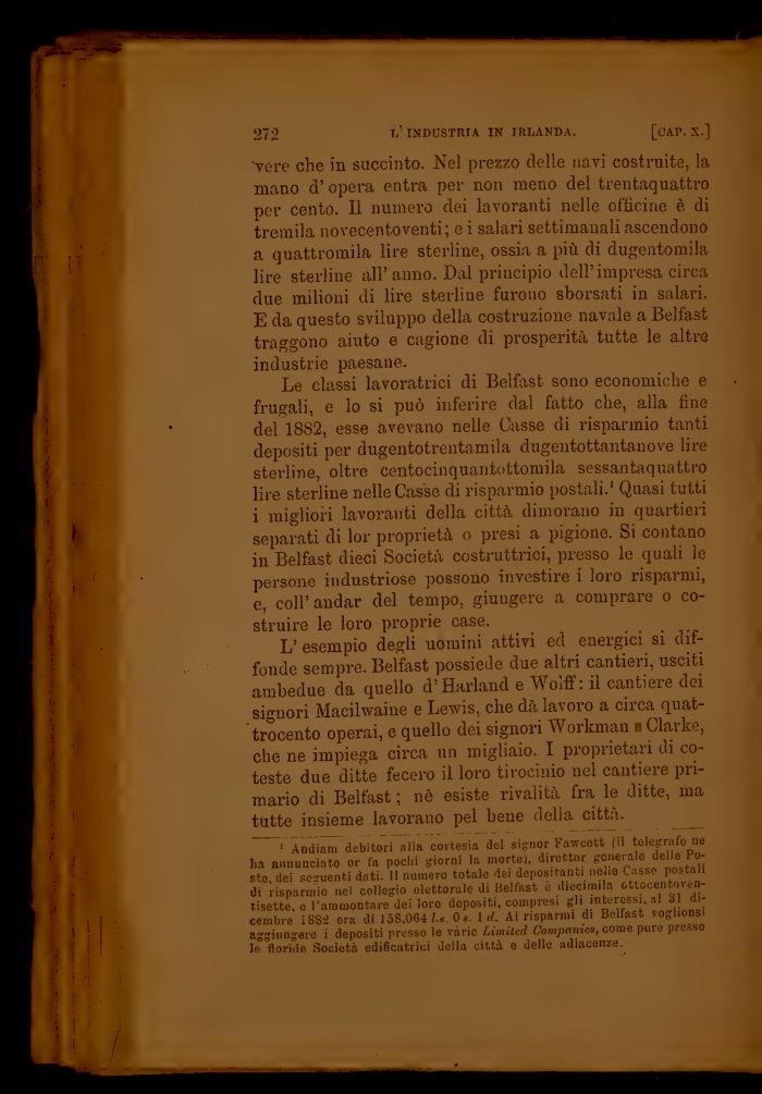 Le classi lavoratrici di Belfast sono economiche e frugali, e lo si può inferire dal fatto che, alla fine del 1SS2, esse avevano nelle Casse di risparmio tanti depositi per dugentotrentamila dugentottantanove lire sterline, oltre centocinquantottomila sessantaquattro lire sterline nelle Casse di risparmio postali.1 Quasi tutti i migliori lavoranti della città dimorano in quartieri separati di lor proprietà o presi a pigione. Si contano in Belfast dieci Società costruttrici, presso le quali le persone industriose possono investire i loro risparmi, e, coli' andar del tempo, giungere a comprare o costruire le loro proprie case.