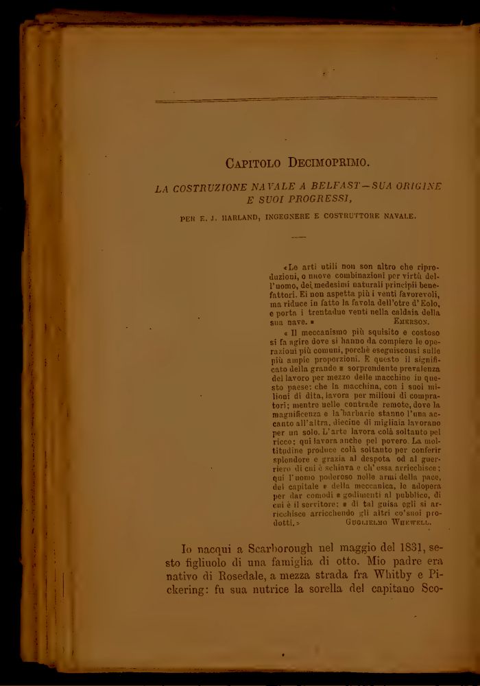 Io nacqui a Scarborough nel maggio del 1S31, sesto figliuolo di una famiglia di otto. Mio padre era nativo di Eosedale, a mezza strada fra Whitby e Pi-ckering: fu sua nutrice la sorella del capitano Sco-
