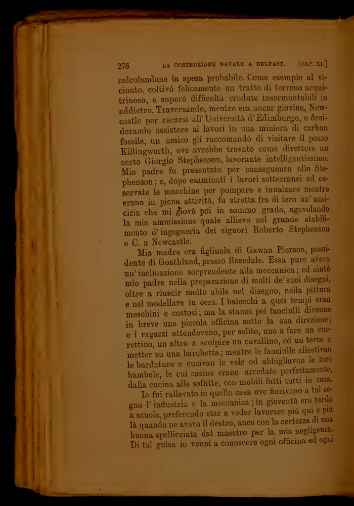 Mia madre era figliuola di Gawan Pierson, possidente di Goathland, presso Rosedale. Essa pure aveva un' incliuazione sorprendente alla meccanica ; ed aiutò mio padre nella preparazione di molti de' suoi disegni, oltre a riuscir molto abile nel disegno, nella pittura e nel modellare in cera. I balocchi a quei tempi eran meschini e costosi; ma la stanza pei fanciulli divenne in breve una piccola officina sotto la sua direzione; e i ragazzi attendevano, per solito, uno a fare un carrettino, un altro a scolpire un cavallino, ed un terzo a metter su una barchetta; mentre le fanciulle allestivan le bardature c cucivan le vele od abbigliavan le loro bambole, le cui casine erano arredate perfettamente, dalla cucina alle soffitte, con mobili fatti tutti in casa.