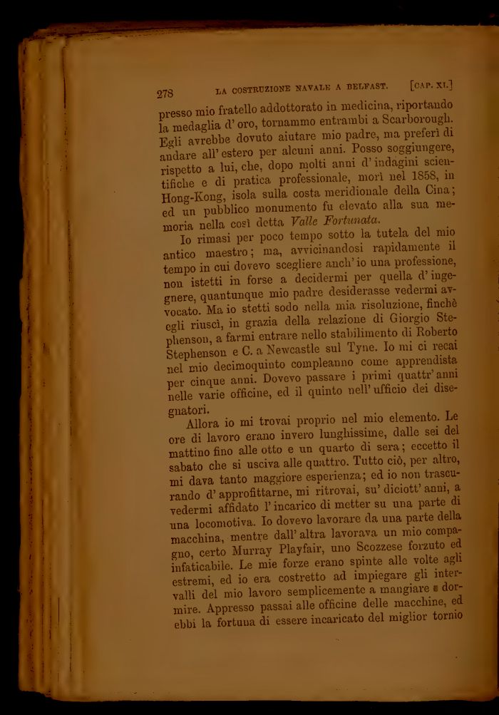 Io rimasi per poco tempo sotto la tutela del mio antico maestro ; ma, avvicinandosi rapidamente il tempo in cui dovevo scegliere anch'io una professione, non istetti in forse a decidermi per quella d'ingegnere, quantunque mio padre desiderasse vedermi avvocato. Ma io stetti sodo nella mia risoluzione, finché egli riuscì, in grazia della relazione di Giorgio Ste-phenson, a farmi entrare nello stabilimento di Roberto Stephenson e C. a Newcastle sul Tyne. Io mi ci recai nel mio decimoquiuto compleanno come apprendista per cinque anni. Dovevo passare i primi quatti1'anni nelle varie officine, ed il quinto nell'ufficio dei disegnatori.
