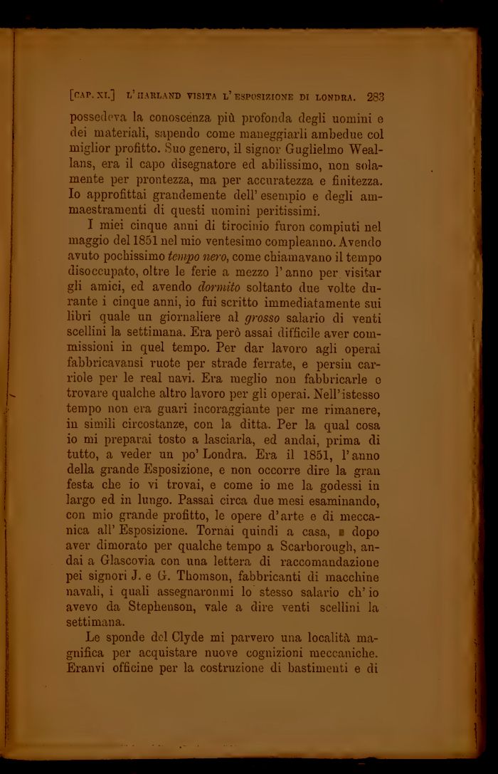I miei cinque anni di tirocinio furon compiuti nel maggio del 1851 nel mio ventesimo compleanno. Avendo avuto pochissimo tempo nero, come chiamavano il tempo disoccupato, oltre le ferie a mezzo l'anno per visitar gli amici, ed avendo dormito soltanto due volte durante i cinque anni, io fui scritto immediatamente sui libri quale un giornaliere al grosso salario di venti scellini la settimana. Era però assai difficile aver commissioni in quel tempo. Per dar lavoro agli operai fabbricavansi ruote per strade ferrate, e persiu carriole per le real navi. Era meglio non fabbricarle e trovare qualche altro lavoro per gli operai. Nell'istesso tempo non era guari incoraggiante per me rimanere, in simili circostanze, con la ditta. Per la qual cosa io mi preparai tosto a lasciarla, ed andai, prima di tutto, a veder un po'Londra, Era il 1851, l'anno della grande Esposizione, e non occorre dire la gran festa che io vi trovai, e come io me la godessi in largo ed in lungo. Passai circa due mesi esaminando, con mio grande profitto, le opere d'arte e di meccanica all' Esposizione. Tornai quindi a casa, e dopo aver dimorato per qualche tempo a Scarborough, andai a Glascovia con una lettera di raccomandazione pei signori J. e G. Thomson, fabbricanti di macchine navali, i quali assegnaronmi lo stesso salario eh' io avevo da Stepheuson, vale a dire venti scellini la settimana.