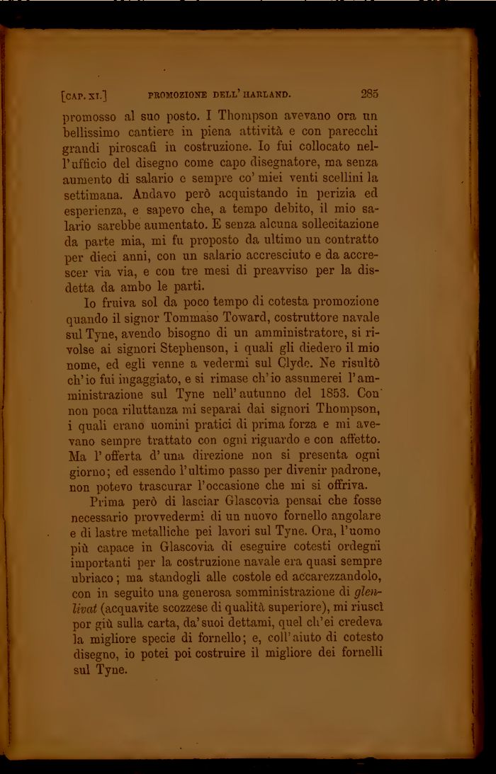 Io fruiva sol da poco tempo di cotesta promozione quando il signor Tommaso Toward, costruttore navale sul Tyne, avendo bisogno di un amministratore, si rivolse ai signori Stephenson, i quali gli diedero il mio nome, ed egli venne a vedermi sul Clyde. Ne risultò ch'io fui ingaggiato, e si rimase ch'io assumerei l'amministrazione sul Tyne nell'autunno del 1853. Con' non poca riluttanza mi separai dai signori Thompson, i quali erano uomini pratici di prima forza e mi avevano sempre trattato con ogni riguardo e con affetto. Ma l'offerta d'una direzione non si presenta ogni giorno; ed essendo l'ultimo passo per divenir padrone, non potevo trascurar l'occasione che mi si offriva.