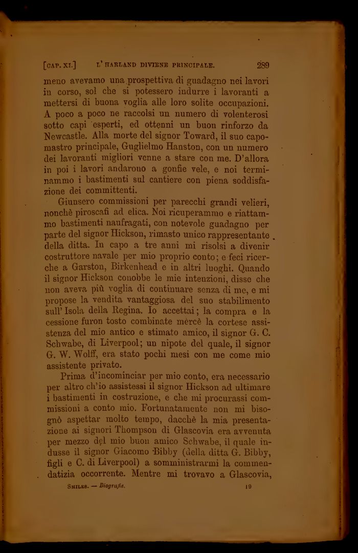 Giunsero commissioni per parecchi grandi velieri, nonché piroscafi ad elica. Noi ricuperammo e riattammo bastimenti naufragati, con notevole guadagno per parte del signor Hickson, rimasto unico rappresentante . della ditta. In capo a tre anni mi risolsi a divenir costruttore navale per mio proprio conto; e feci ricerche a Garston, Birkenhead e in altri luoghi. Quando il signor Hickson conobbe le mie intenzioni, disse che non aveva più voglia di continuare senza di me, e mi propose la vendita vantaggiosa del suo stabilimento sull' Isola della Regina. Io accettai ; la compra e la cessione furon tosto combinate mèrcè la cortese assistenza del mio antico e stimato amico, il signor G. C. Schwabe, di Liverpool; un nipote del quale, il signor G. W. VVolff, era stato pochi mesi con me come mio assistente privato.