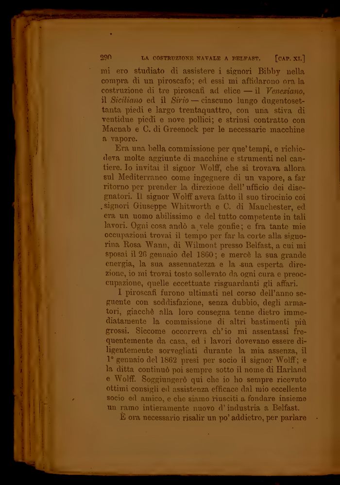 Era una bella commissione per que'tempi, e richiedeva molte aggiunte di macchine e strumenti nel cantiere. Io invitai il signor Wolff, che si trovava allora sul Mediterraneo come ingegnere di un vapore, a far ritorno per prender la direzione dell' ufficio dei disegnatori. Il signor Wolff aveva fatto il suo tirocinio coi .signori Giuseppe Whitworth e G. di Manchester, ed era un uomo abilissimo e del tutto competente in tali lavori. Ogni cosa andò a vele gonfie ; e fra tante mie occupazioni trovai il tempo per far la corte alla signorina Rosa Wann, di Wilmont presso Belfast, a cui mi sposai il 2fi gennaio del 1S60; e mercè la sua grande energia, la sua assennatezza e la -sua esperta direzione, io mi trovai tosto sollevato da ogni cura e preoccupazione, quelle eccettuate risguardanti gli affari.