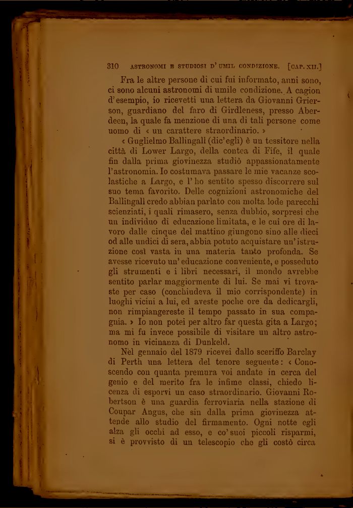 « Guglielmo Ballingall (die'egli) è un tessitore nella città di Lower Largo, della contea di Fife, il quale fin dalla prima giovinezza studiò appassionatamente l'astronomia. Io costumava passare le mie vacanze scolastiche a Largo, e 1' ho sentito spesso discorrere sul suo tema favorito. Delle cognizioni astronomiche del Ballingall credo abbiati parlato con molta lode parecchi scienziati, i quali rimasero, senza dubbio, sorpresi che un individuo di educazione limitata, e le cui ore di lavoro dalle cinque del mattino giungono sino alle dieci od alle undici di sera, abbia potuto acquistare un' istruzione così vasta in una materia tanto profonda. Se avesse ricevuto un' educazione conveniente, e posseduto gli strumenti e i libri necessari, il mondo avrebbe sentito parlar maggiormente di lui. Se mai vi trovaste per caso (conchiudeva il mio corrispondente) in luoghi vicini a lui, ed aveste poche ore da dedicargli, non rimpiangereste il tempo passato in sua compagnia. > Io non potei per altro far questa gita a Largo; ma mi fu invece possibile di visitare un altro astronomo in vicinanza di Dunkeld.