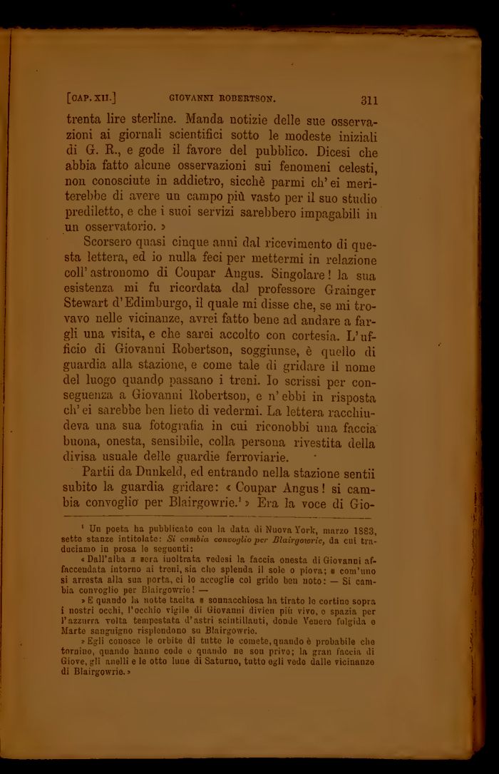 Scorsero quasi cinque anni dal ricevimento di questa lettera, ed io nulla feci per mettermi in relazione coli' astronomo di Coupar Angus. Singolare ! la sua esistenza mi fu ricordata dal professore Grainger Stewart d'Edimburgo, il quale mi disse che, se mi trovavo nelle vicinanze, avrei fatto bene ad andare a fargli una visita, e che sarei accolto con cortesia. L'ufficio di Giovanni Robertson, soggiunse, è quello di guardia alla stazione, e come tale di gridare il nome del luogo quandp passano i treni. Io scrissi per conseguenza a Giovanni Robertson, e n' ebbi in risposta eh' ei sarebbe ben lieto di vedermi. La lettera racchiudeva una sua fotografia in cui riconobbi una faccia buona, onesta, sensibile, colla persona rivestita della divisa usuale delle guardie ferroviarie.