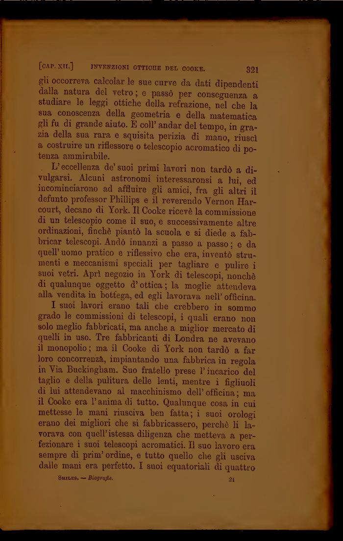 I suoi lavori erano tali che crebbero in sommo grado le commissioni di telescopi, i quali erano non solo meglio fabbricati, ma anche a miglior mercato di quelli in uso. Tre fabbricanti di Londra ne avevano il monopolio; ma il Cooke di York non tardò a far loro concorrenza, impiantando una fabbrica in regola in Vìa Buckingham. Suo fratello prese l'incarico del taglio e della pulitura delle lenti, mentre i figliuoli di lui attendevano al macchinismo dell'officina; ma il Cooke era l'anima di tutto. Qualunque cosa in cui mettesse le mani riusciva ben fatta; i suoi orologi erano dei migliori che si fabbricassero, perchè li lavorava con quell' istessa diligenza che metteva a perfezionare i suoi telescopi acromatici. Il suo lavoro era sempre di prim' ordine, e tutto quello che gli usciva dalle mani era perfetto. I suoi equatoriali di quattro