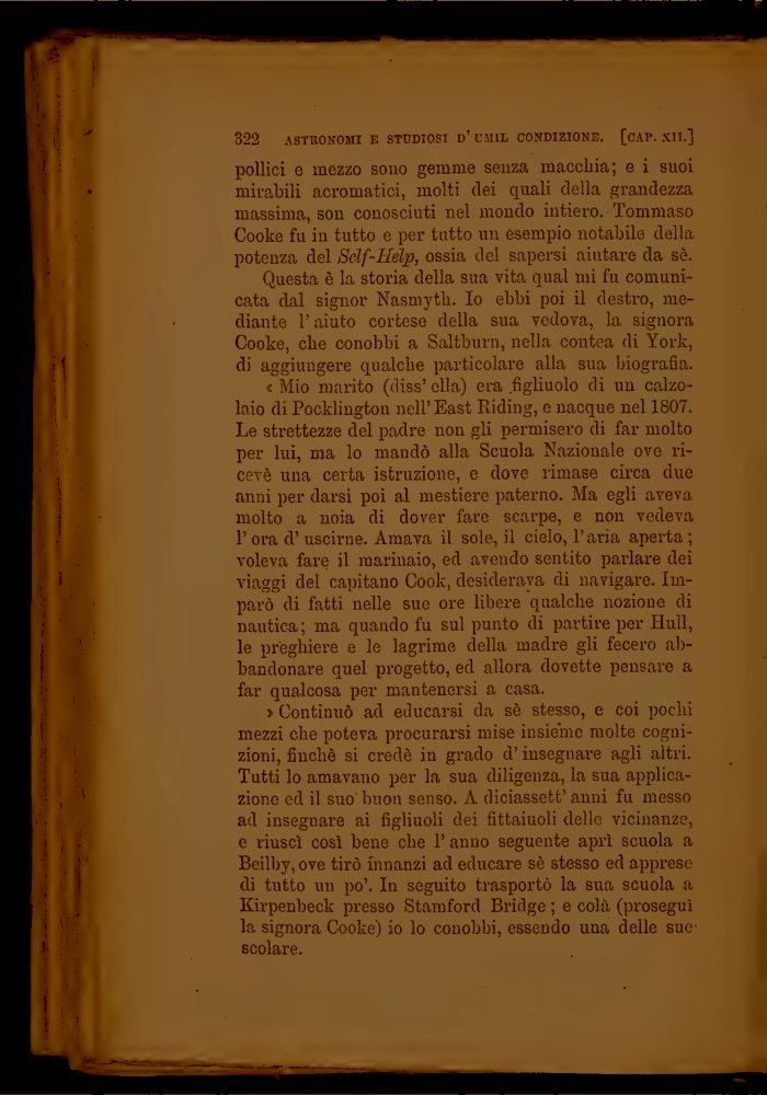 pollici e mezzo sono gemme senza macchia; e i suoi mirabili acromatici, molti dei quali della grandezza massima, son conosciuti nel mondo intiero. Tommaso Cooke fu in tutto e per tutto un esempio notabile della potenza del Sdf-Hélp, ossia del sapersi aiutare da sè.