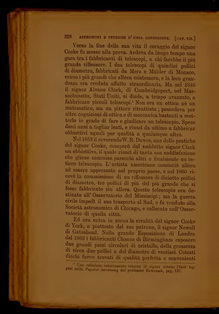 Verso la fine della sua vita il coraggio del signor Gooke fu messo alla prova. Ardeva da lungo tempo una gara tra i fabbricanti di telescopi, a chi farebbe il più grande riflessore. I due telescopi di quindici pollici di diametro, fabbricati da Merz e Mahler di Monaco, erano i più grandi che allora esistessero, e la loro grandezza era creduta affatto straordinaria. Ma nel 1846 il signor Alvano Clark, di Cambricigeport, nel Massachusetts, Stati Uniti, si diede, a tempo avanzato, a fabbricare piccoli telescopi.1 Non era un ottico nè un matematico, ma un pittore ritrattista ; possedeva per altro cognizioni di ottica e di meccanica bastanti a metterlo in grado di fare e giudicare un telescopio. Spese dieci anni a tagliar lenti, e riuscì da ultimo a fabbricar obbiettivi uguali per qualità a qualunque altro.