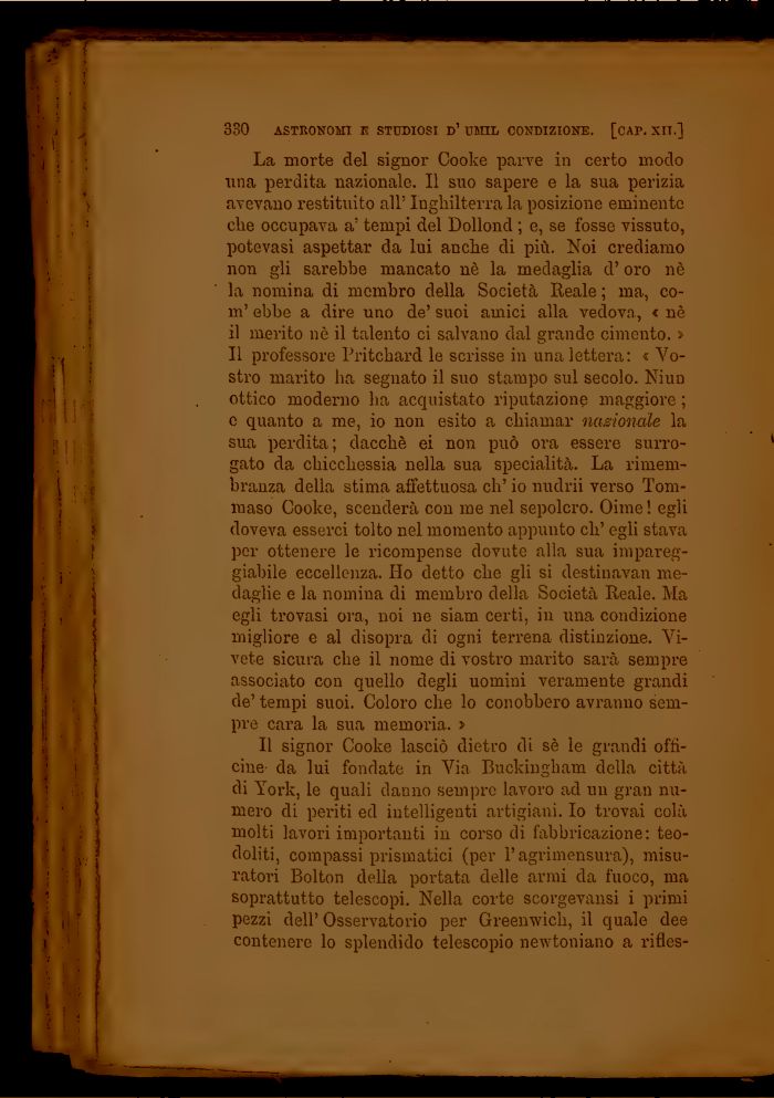 La morte del signor Cooke parve in certo modo una perdita nazionale. Il suo sapere e la sua perizia avevano restituito all' Inghilterra la posizione eminente che occupava a' tempi del Dollond ; e, se fosse vissuto, potevasi aspettar da lui anche eli pił. Noi crediamo non gli sarebbe mancato uč la medaglia d'oro nč la nomina di membro della Societą Reale ; ma, co-in' ebbe a dire uno de' suoi amici alla vedova, « nč il merito nč il talento ci salvano dal grande cimento. » Il professore Pritchard le scrisse in una lettera: « Vostro marito ha segnato il suo stampo sul secolo. Nģud ottico moderno ha acquistato riputazione maggiore ; e quanto a me, io non esito a chiamar nazionale la sua perdita ; dacché ei non puņ ora essere surrogato da chicchessia nella sua specialitą. La rimembranza della stima affettuosa eh' io nudrii verso Tommaso Cooke, scenderą con me nel sepolcro. Oime ! egli doveva esserci tolto nel momento appunto eh' egli stava per ottenere le ricompense dovute alla sua impareggiabile eccellenza. Ho detto che gli si destinavan medaglie e la nomina di membro della Societą Reale. Ma egli trovasi ora, noi ne siam certi, in una condizione migliore e al disopra di ogni terrena distinzione. Vivete sicura che il nome di vostro marito sarą sempre associato con quello degli uomini veramente grandi de' tempi suoi. Coloro che lo conobbero avranno sempre cara la sua memoria. »