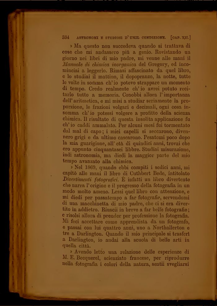» Ma questo non succedeva quando si trattava di cose che mi andassero più a genio. Rovistando un giorno nei libri di mio padre, mi venne alle mani il Manuale di chimica inorganica del Gregory, ed incominciai a leggerlo. Rimasi affascinato da quel libro, e lo studiai il mattino, il dopopranzo, la notte, tutte le volte in somma eh' io potevo strappare un momento di tempo. Credo realmente eh' io avrei potuto recitarlo tutto a memoria. Conobbi allora l'importanza dell' aritmetica, e mi misi a studiar seriamente la proporzione, le frazioni volgari e decimali, ogni cosa insomma eh' io potessi volgere a profitto della scienza chimica. Il risultato di questa insolita applicazione fu eh' io caddi ammalato. Per alcuni mesi fui tormentato dal mal di capo ; i miei capelli si seccarono, divennero grigi e da ultimo cascarono. Pesatomi poco dopo la mia guarigione, all' età di quindici anni, trovai che ero appunto cinquantasei libbre. Studiai misurazione, indi astronomia, ma diedi la maggior parte del mio tempo avanzato alla chimica.