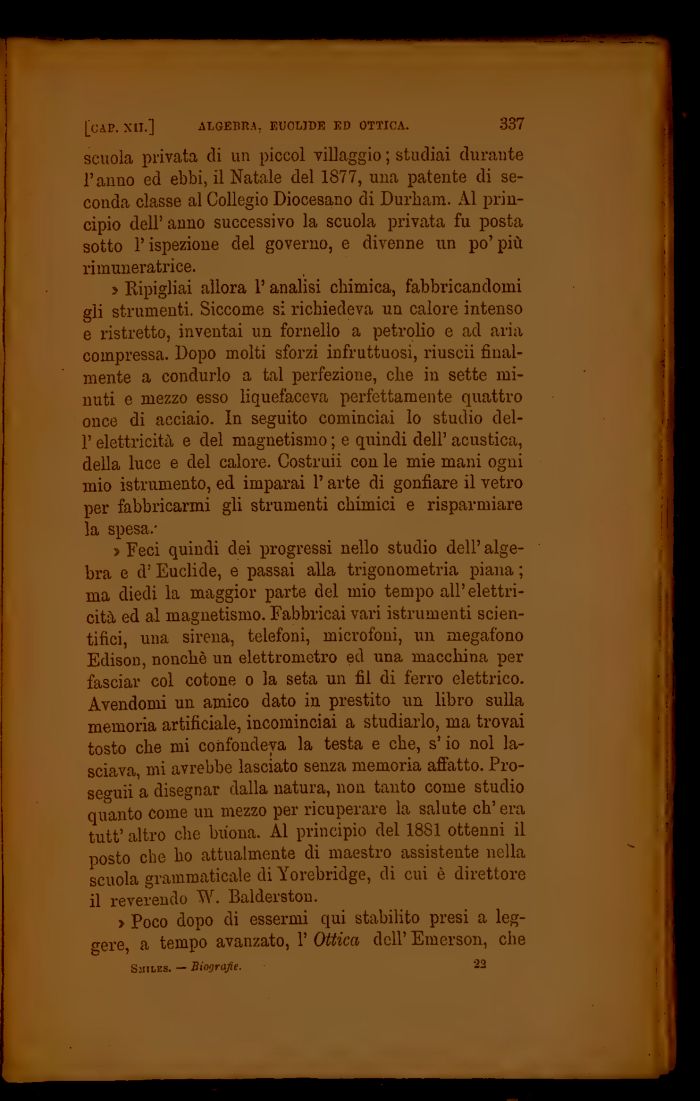 » Feci quindi dei progressi nello studio dell' algebra e d'Euclide, e passai alla trigonometria piana ; ma diedi la maggior parte del mio tempo all'elettricità ed al magnetismo. Fabbricai vari istrumenti scientifici, una sirena, telefoni, microfoni, un megafono Edison, nonché un elettrometro ed una macchina per fasciar col cotone o la seta un fil di ferro elettrico. Avendomi un amico dato in prestito un libro sulla memoria artificiale, incominciai a studiarlo, ma trovai tosto che mi confondeva la testa e che, s'io noi lasciava, mi avrebbe lasciato senza memoria affatto. Proseguii a disegnar dalla natura, non tanto come studio quanto come un mezzo per ricuperare la salute eh' era tutt' altro che buona. Al principio del 18S1 ottenni il posto che ho attualmente di maestro assistente nella scuola grammaticale di Yorebridge, di cui è direttore il reverendo W. Balderston.