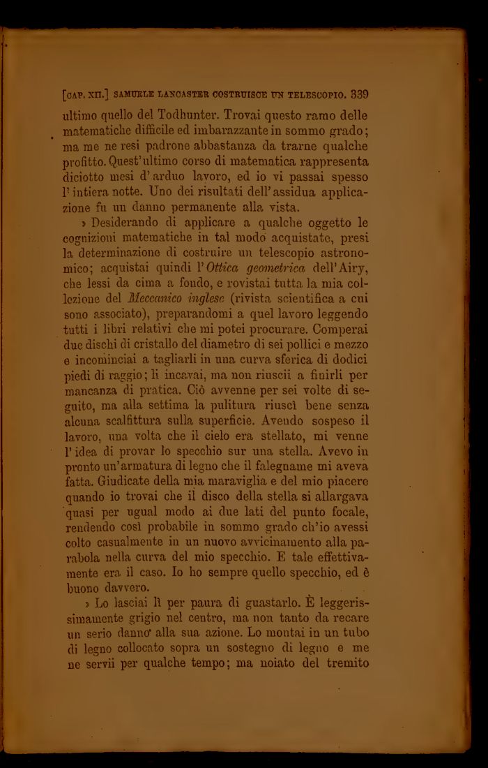> Desiderando di applicare a qualche oggetto le cognizioni matematiche in tal modo acquistate, presi la determinazione di costruire un telescopio astronomico; acquistai quindi l'Ottica geometrica dell'Airy, che lessi da cima a fondo, e rovistai tutta la mia collezione del Meccanico inglese (rivista scientifica a cui sono associato), preparandomi a quel lavoro leggendo tutti i libri relativi che mi potei procurare. Comperai due dischi di cristallo del diametro di sei pollici e mezzo e incominciai a tagliarli in una curva sferica di dodici piedi di raggio ; li incavai, ma non riuscii a finirli per mancanza di pratica. Ciò avvenne per sei volte di seguito, ma alla settima la pulitura riuscì bene senza alcuna scalfittura sulla superficie. Avendo sospeso il lavoro, ima volta che il cielo era stellato, mi venne l'idea di provar lo specchio sur una stella. Avevo in pronto un'armatura di legno che il falegname mi aveva fatta. Giudicate della mia maraviglia e del mio piacere quando io trovai che il disco della stella si allargava quasi per ugual modo ai due lati del punto focale, rendendo così probabile in sommo grado ch'io avessi colto casualmente in un nuovo avvicinamento alla parabola nella curva del mio specchio. E tale effettivamente era il caso. Io ho sempre quello specchio, ed è buono davvero.