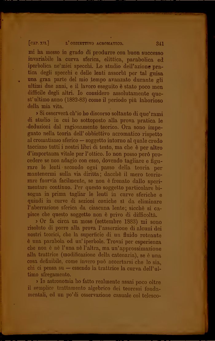 mi ha messo in grado di produrre con buon successo invariabile la curva sferica, elittica, parabolica ed iperbolica ne'miei specchi. Lo studio dell'azione pratica degli specchi e delle lenti assorbì per tal guisa una gran parte del mio tempo avanzato durante gli ultimi due anni, e il lavoro eseguito è stato poco men difficile degli altri. Io considero assolutamente quest'ultimo anno (1882-83) come il periodo più laborioso della mia vita.