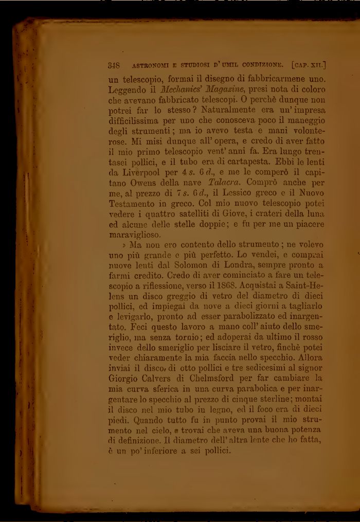 ? Ma non ero contento dello strumento ; ne volevo uno più grande e più perfetto. Lo vendei, e comprai nuove lenti dal Solomon di Londra, sempre pronto a farmi credito. Credo di aver cominciato a fare un telescopio a riflessione, verso il 1S68. Acquistai a Saint-He-lens un disco greggio di vetro del diametro di dieci pollici, ed impiegai da nove a dieci giorni a tagliarlo e levigarlo, pronto ad esser parabolizzato ed inargentato. Feci questo lavoro a mano coli' aiuto dello smeriglio, ma senza tornio; ed adoperai da ultimo il rosso invece dello smeriglio per lisciare il vetro, finché potei veder chiaramente la mia faccia nello specchio. Allora inviai il disco/ di otto pollici e tre sedicesimi al signor Giorgio Calvers di Chelmsford per far cambiare la mia curva sferica in una curva parabolica e per inargentare lo specchio al prezzo di cinque sterline; montai il disco nel mio tubo in legno, ed il foco era di dieci piedi. Quando tutto fu in punto provai il mio strumento nel cielo, « trovai che aveva una buona potenza di definizione. Il diametro dell'altra lente che ho fatta, è un po' inferiore a sei pollici.