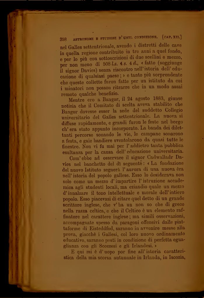 Mentre ero a Baugor, il 24 agosto 1883, giunse notizia che il Comitato di scelta aveva stabilito che Bangor dovesse esser la sede del suddetto Collegio universitario del Galles settentrionale. La nuova si diffuse rapidamente, e grandi furon le feste nel borgo eh' era stato appunto incorporato. La banda dei dilettanti percorse sonando le vie, le campane sonarono a festa, e gaie bandiere sventolarono da quasi tutte le finestre. Non vi fu mai per l'addietro tanta pubblica esultanza per la causa dell' educazione universitaria.