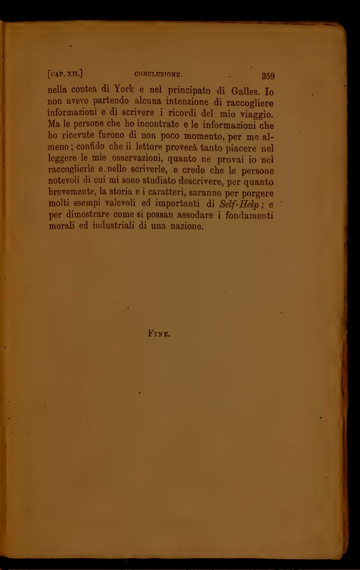 nella contea di York e nel principato di Galles. Io non avevo partendo alcuna intenzione di raccogliere informazioni e di scrivere i ricordi del mio viaggio. Ma le persone che ho incontrate e le informazioni che ho ricevute furono di non poco momento, per me almeno ; confido che il lettore proverā tanto piacere nel leggere le mie osservazioni, quanto ne provai io nel raccoglierle e. nello scriverle, e credo che le persone notevoli di cui mi sono studiato descrivere, per quanto brevemente, la storia e i caratteri, saranno per porgere molti esempi valevoli ed importanti di Self-Čelp ; e per dimostrare come si possan assodare i fondamenti morali ed industriali di una nazione.