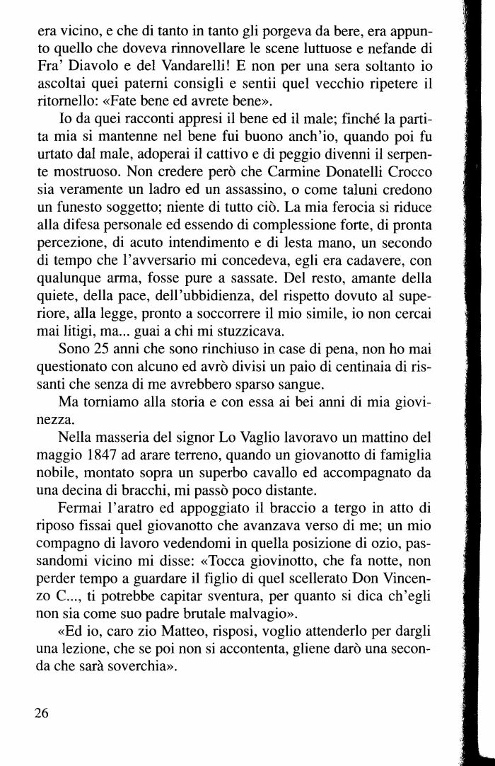 Io da quei racconti appresi il bene ed il male; finché la partita mia si mantenne nel bene fui buono anch'io, quando poi fu urtato dal male, adoperai il cattivo e di peggio divenni il serpente mostruoso. Non credere però che Carmine Donatelli Crocco sia veramente un ladro ed un assassino, o come taluni credono un funesto soggetto; niente di tutto ciò. La mia ferocia si riduce alla difesa personale ed essendo di complessione forte, di pronta percezione, di acuto intendimento e di lesta mano, un secondo di tempo che l'avversario mi concedeva, egli era cadavere, con qualunque arma, fosse pure a sassate. Del resto, amante della quiete, della pace, dell'ubbidienza, del rispetto dovuto al superiore, alla legge, pronto a soccorrere il mio simile, io non cercai mai litigi, ma... guai a chi mi stuzzicava.