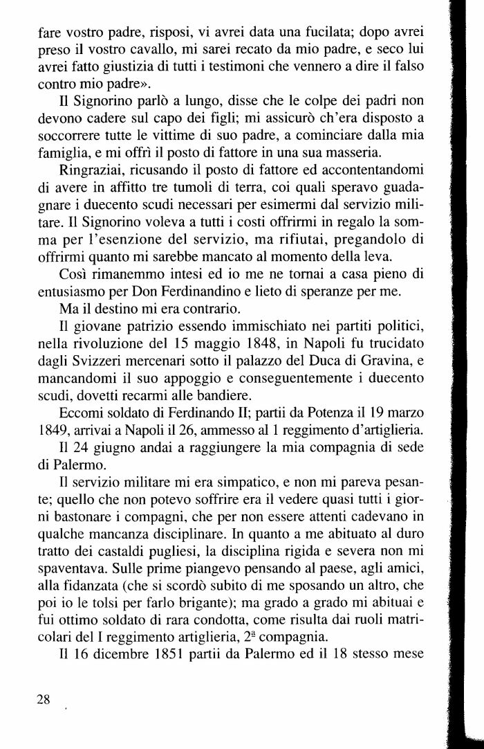 Il servizio militare mi era simpatico, e non mi pareva pesante; quello che non potevo soffrire era il vedere quasi tutti i giorni bastonare i compagni, che per non essere attenti cadevano in qualche mancanza disciplinare. In quanto a me abituato al duro tratto dei castaidi pugliesi, la disciplina rigida e severa non mi spaventava. Sulle prime piangevo pensando al paese, agli amici, alla fidanzata (che si scordò subito di me sposando un altro, che poi io le tolsi per farlo brigante); ma grado a grado mi abituai e fui ottimo soldato di rara condotta, come risulta dai ruoli matricolari del I reggimento artiglieria, 2- compagnia.