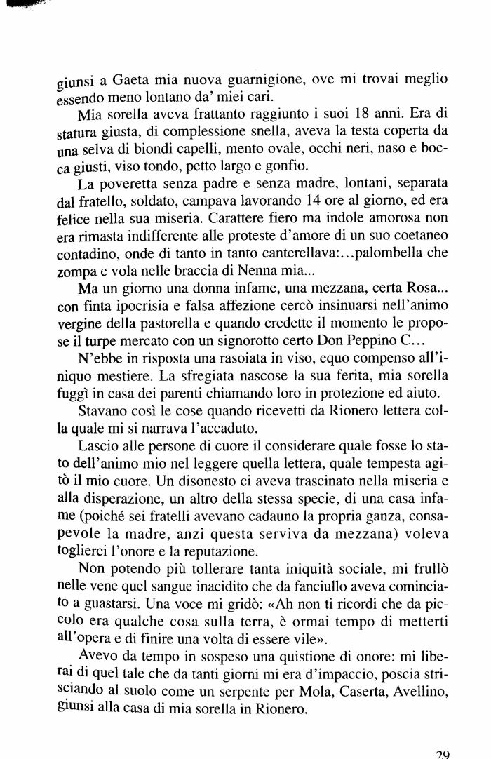 Avevo da tempo in sospeso una quistione di onore: mi liberai di quel tale che da tanti giorni mi era d'impaccio, poscia strisciando al suolo come un serpente per Mola, Caserta, Avellino, giunsi alla casa di mia sorella in Rionero.