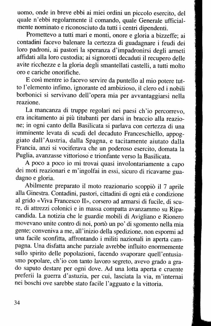 Abilmente preparato il moto reazionario scoppiò il 7 aprile alla Ginestra. Contadini, pastori, cittadini di ogni età e condizione al grido «Viva Francesco II», corsero ad armarsi di fucile, di scure, di attrezzi colonici e in massa compatta avanzammo su Ripa-candida. La notizia che le guardie mobili di Avigliano e Rionero movevano unite contro di noi, portò un po' di sgomento nella mia gente; conveniva a me, all'inizio della spedizione, non espormi ad una facile sconfitta, affrontando i militi nazionali in aperta campagna. Una disfatta anche parziale avrebbe influito enormemente sullo spirito delle popolazioni, facendo svaporare quell'entusiasmo popolare, ch'io con tanto lavoro segreto, avevo grado a grado saputo destare per ogni dove. Ad una lotta aperta e cruente preferii la guerra d'astuzia, per cui, lasciata la via, m'internai nei boschi ove sarebbe stato facile l'agguato e la vittoria.
