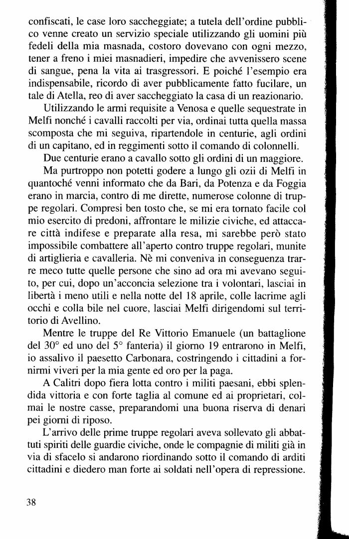 confiscati, le case loro saccheggiate; a tutela dell'ordine pubblico venne creato un servizio speciale utilizzando gli uomini più fedeli della mia masnada, costoro dovevano con ogni mezzo, tener a freno i miei masnadieri, impedire che avvenissero scene di sangue, pena la vita ai trasgressori. E poiché l'esempio era indispensabile, ricordo di aver pubblicamente fatto fucilare, un tale di Atella, reo di aver saccheggiato la casa di un reazionario.