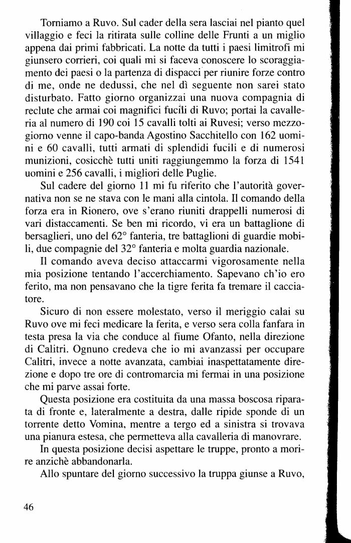 Torniamo a Ruvo. Sul cader della sera lasciai nel pianto quel villaggio e feci la ritirata sulle colline delle Frunti a un miglio appena dai primi fabbricati. La notte da tutti i paesi limitrofi mi giunsero corrieri, coi quali mi si faceva conoscere lo scoraggiamento dei paesi o la partenza di dispacci per riunire forze contro di me, onde ne dedussi, che nel dì seguente non sarei stato disturbato. Fatto giorno organizzai una nuova compagnia di reclute che armai coi magnifici fucili di Ruvo; portai la cavalleria al numero di 190 coi 15 cavalli tolti ai Ruvesi; verso mezzogiorno venne il capo-banda Agostino Sacchitello con 162 uomini e 60 cavalli, tutti armati di splendidi fucili e di numerosi munizioni, cosicché tutti uniti raggiungemmo la forza di 1541 uomini e 256 cavalli, i migliori delle Puglie.