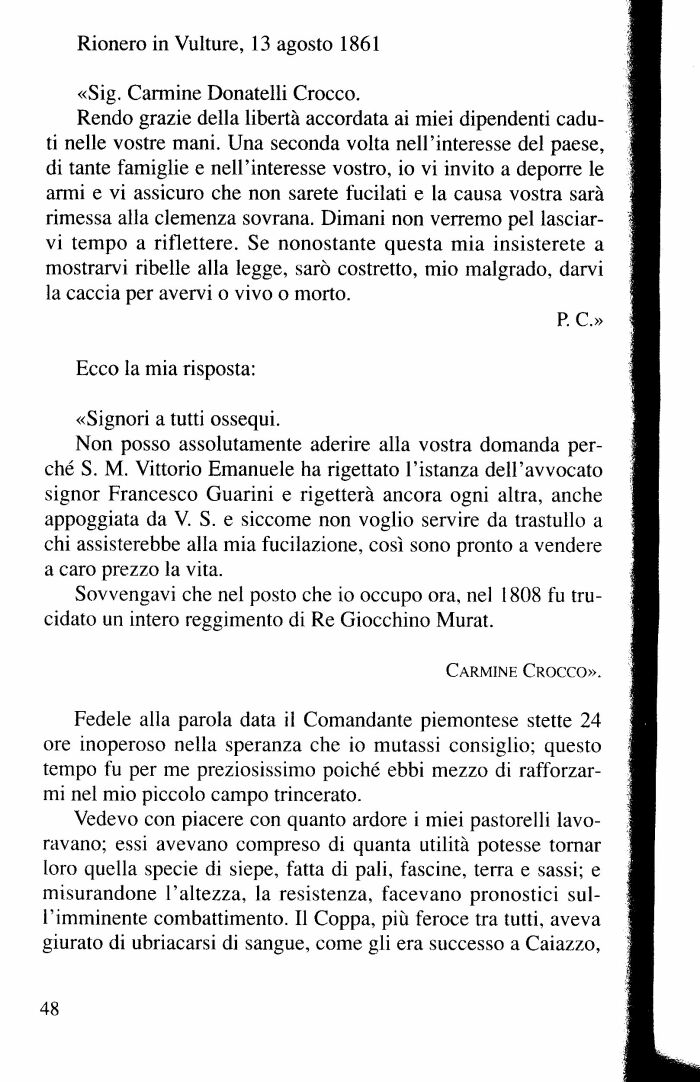 Rendo grazie della libertà accordata ai miei dipendenti caduti nelle vostre mani. Una seconda volta nell'interesse del paese, di tante famiglie e nell'interesse vostro, io vi invito a deporre le armi e vi assicuro che non sarete fucilati e la causa vostra sarà rimessa alla clemenza sovrana. Dimani non verremo pel lasciarvi tempo a riflettere. Se nonostante questa mia insisterete a mostrarvi ribelle alla legge, sarò costretto, mio malgrado, darvi la caccia per avervi o vivo o morto.
