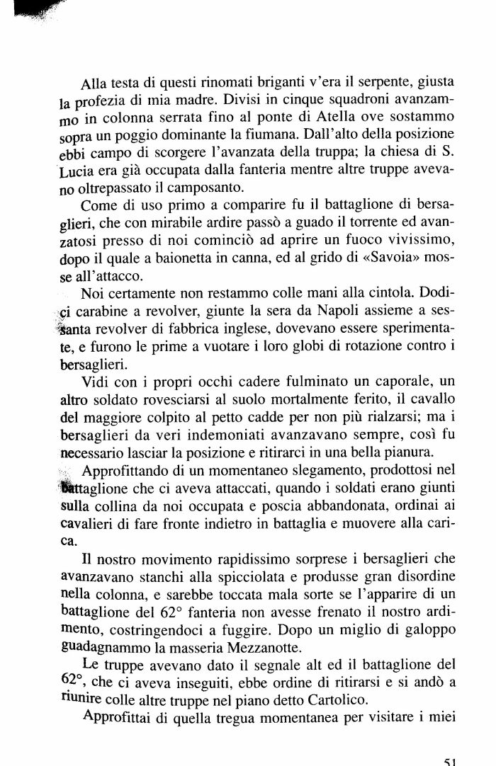 Alla testa di questi rinomati briganti v'era il serpente, giusta la profezia di mia madre. Divisi in cinque squadroni avanzammo in colonna serrata fino al ponte di Atella ove sostammo sopra un poggio dominante la fiumana. Dall'alto della posizione ebbi campo di scorgere l'avanzata della truppa; la chiesa di S. Lucia era già occupata dalla fanteria mentre altre truppe avevano oltrepassato il camposanto.