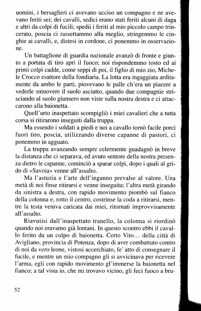 Riavutisi dall'inaspettato tranello, la colonna si riordinò quando noi eravamo già lontani. In questo scontro ebbi il cavallo ferito da un colpo di baionetta. Certo Vito... della città di Avigliano, provincia di Potenza, dopo di aver combattuto contro di noi da vero leone, vistosi accerchiato, fe' atto di consegnare il fucile, e mentre un mio compagno gli si avvicinava per ricevere l'arma, egli con rapido movimento gl'immerse la baionetta nel fianco; a tal vista io, che mi trovavo vicino, gli feci fuoco a bru-