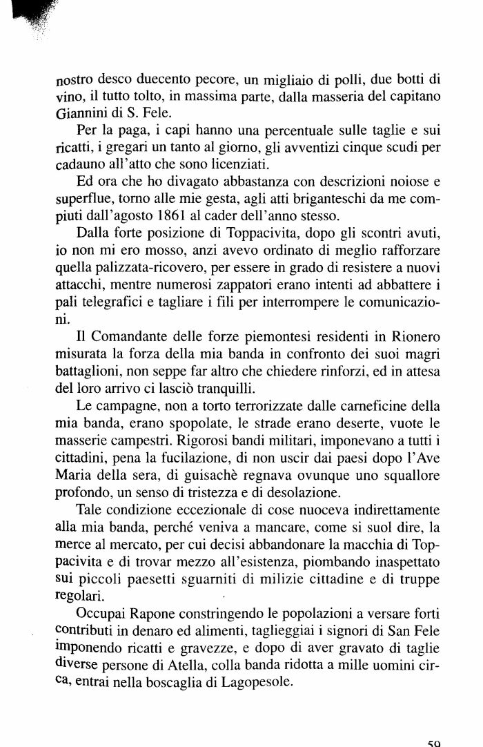 Le campagne, non a torto terrorizzate dalle carneficine della mia banda, erano spopolate, le strade erano deserte, vuote le masserie campestri. Rigorosi bandi militari, imponevano a tutti i cittadini, pena la fucilazione, di non uscir dai paesi dopo l'Ave Maria della sera, di guisachè regnava ovunque uno squallore profondo, un senso di tristezza e di desolazione.