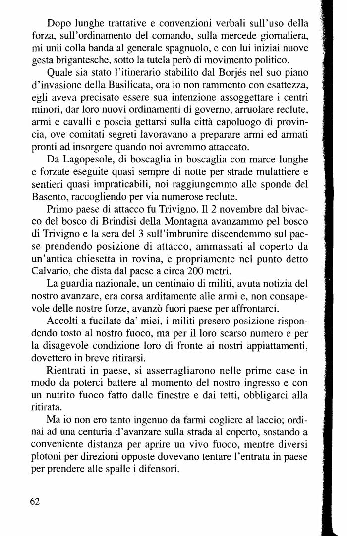 Quale sia stato l'itinerario stabilito dal Borjés nel suo piano d'invasione della Basilicata, ora io non rammento con esattezza, egli aveva precisato essere sua intenzione assoggettare i centri minori, dar loro nuovi ordinamenti di governo, arruolare reclute, armi e cavalli e poscia gettarsi sulla città capoluogo di provincia, ove comitati segreti lavoravano a preparare armi ed armati pronti ad insorgere quando noi avremmo attaccato.
