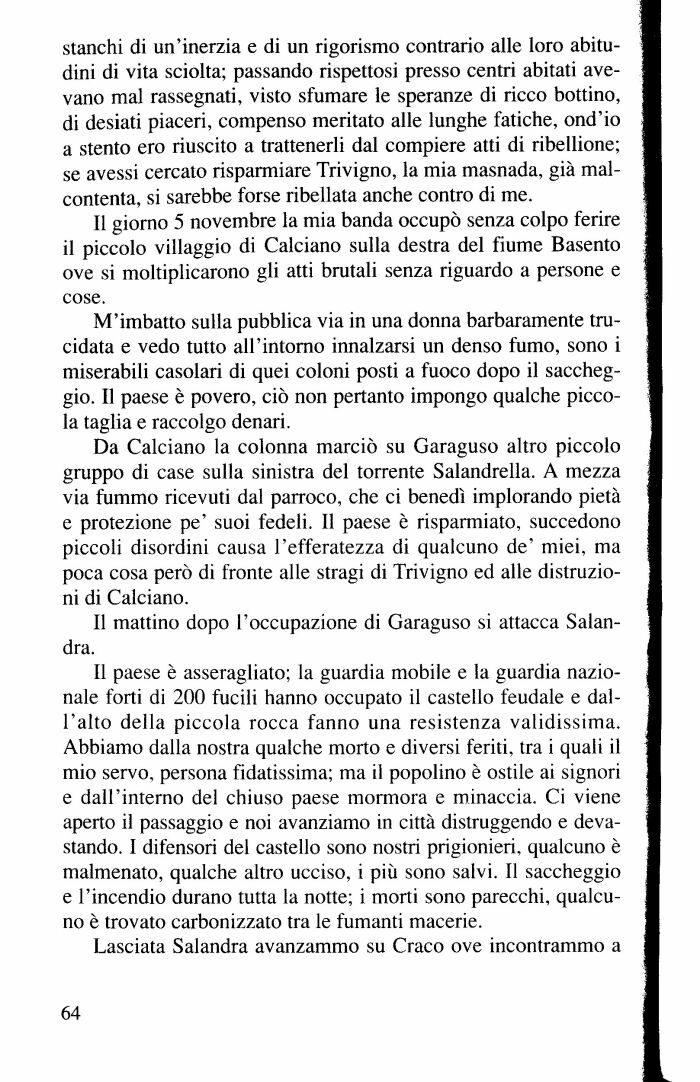 Il giorno 5 novembre la mia banda occupò senza colpo ferire il piccolo villaggio di Calciano sulla destra del fiume Basento ove si moltiplicarono gli atti brutali senza riguardo a persone e cose.