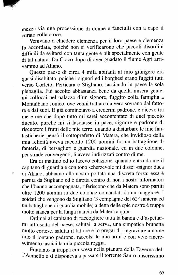 Questo paese di circa 4 mila abitanti al mio giungere era quasi disabitato, poiché i signori ed i borghesi erano fuggiti tutti verso Corleto, Perticara e Stigliano, lasciando in paese la sola plebaglia. Fui accolto abbastanza bene da quella misera gente; mi collocai nel palazzo d'un signore, fuggito colla famiglia a Montalbano Jonico, ove venni trattato da vero sovrano dal fattore e dai suoi. E già cominciavo a credermi padrone, e dicevo tra me e me che dopo tutto mi sarei accontentato di quel piccolo ducato, purché mi si lasciasse in pace, signore e padrone di riscuotere i frutti delle mie terre, quando a disturbare le mie fantasticherie pensò il sottoprefetto di Matera, che invidioso della mia felicità aveva raccolto 1200 uomini fra un battaglione di fanteria, di bersaglieri e guardia nazionale, ed in due colonne, per strade convergenti, li aveva indirizzati contro di me.