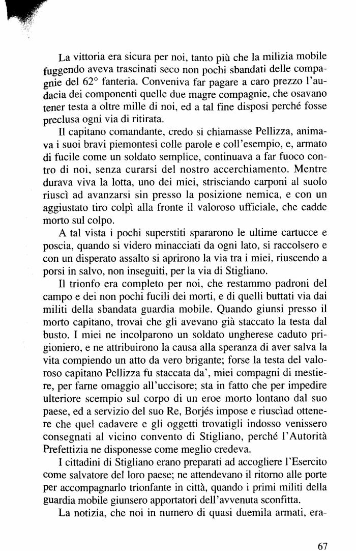 Il trionfo era completo per noi, che restammo padroni del campo e dei non pochi fucili dei morti, e di quelli buttati via dai militi della sbandata guardia mobile. Quando giunsi presso il morto capitano, trovai che gli avevano già staccato la testa dal busto. I miei ne incolparono un soldato ungherese caduto prigioniero, e ne attribuirono la causa alla speranza di aver salva la vita compiendo un atto da vero brigante; forse la testa del valoroso capitano Pellizza fu staccata da', miei compagni di mestiere, per farne omaggio all'uccisore; sta in fatto che per impedire ulteriore scempio sul corpo di un eroe morto lontano dal suo paese, ed a servizio del suo Re, Borjés impose e riuscìad ottenere che quel cadavere e gli oggetti trovatigli indosso venissero consegnati al vicino convento di Stigliano, perché l'Autorità Prefettizia ne disponesse come meglio credeva.