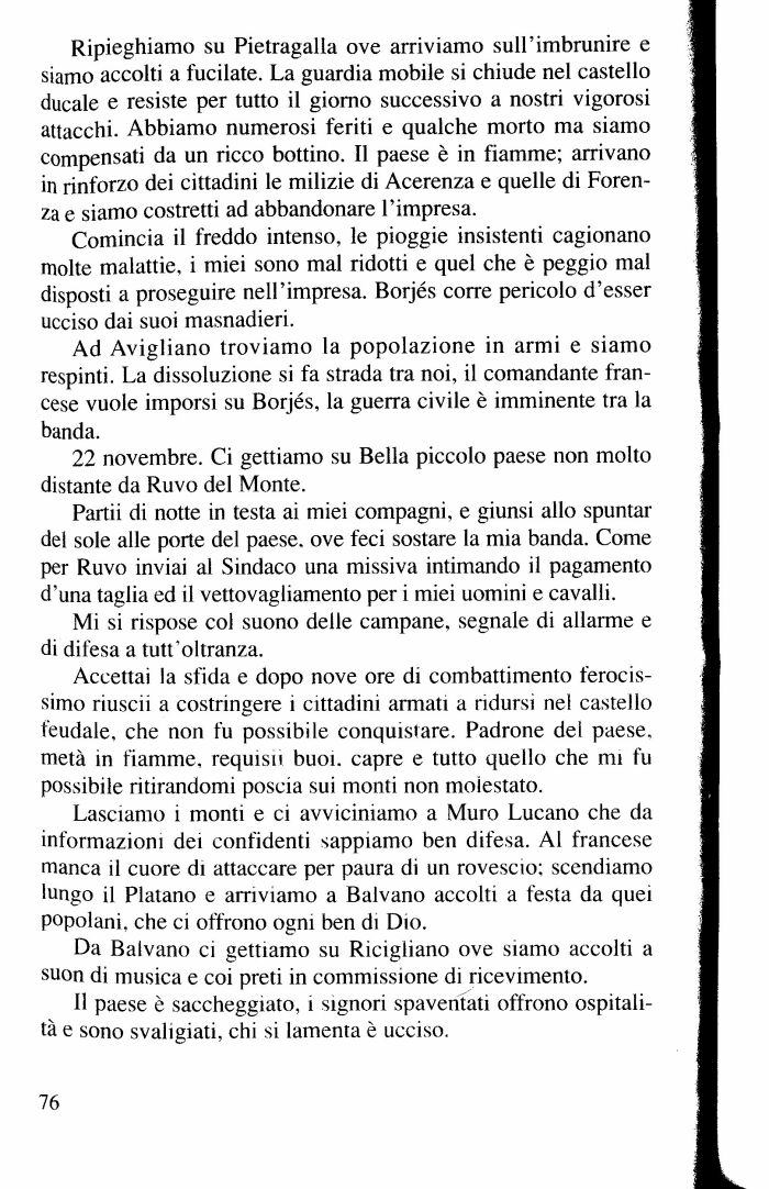 Partii di notte in testa ai miei compagni, e giunsi allo spuntar del sole alle porte del paese, ove feci sostare la mia banda. Come per Ruvo inviai al Sindaco una missiva intimando il pagamento d'una taglia ed il vettovagliamento per i miei uomini e cavalli.