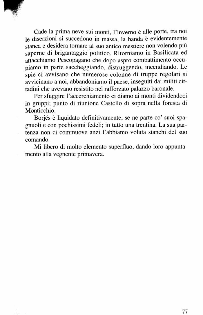 Cade la prima neve sui monti, l'inverno è alle porte, tra noi le diserzioni si succedono in massa, la banda è evidentemente stanca e desidera tornare al suo antico mestiere non volendo più saperne di brigantaggio politico. Ritorniamo in Basilicata ed attacchiamo Pescopagano che dopo aspro combattimento occupiamo in parte saccheggiando, distruggendo, incendiando. Le spie ci avvisano che numerose colonne di truppe regolari si avvicinano a noi, abbandoniamo il paese, inseguiti dai militi cittadini che avevano resistito nel rafforzato palazzo baronale.